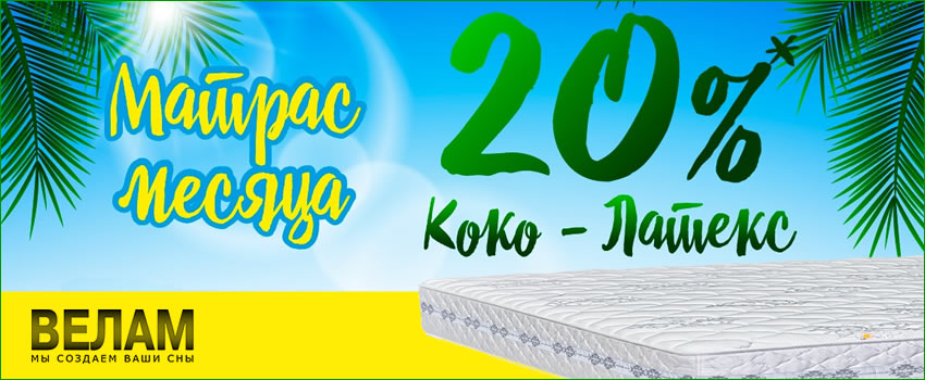 Акция от тм Велам: скидка -20% на ортопедический матрас Коко-Латекс  - матрас средней жесткости с натуральным латексом и кокосовой койрой.