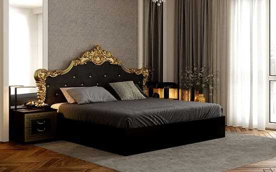 К замечательным примерам нестандартного сочетания классического стиля и черного глянцевого цвета, можно отнести роскошную кровать Реджина. Кровать смотрится очень эффектно в интерьере классической спальни, при этом не перегружая его лишними деталями. Такой эффект достигается благодаря нейтральной отделке стен и правильно подобранному декору теплых оттенков.