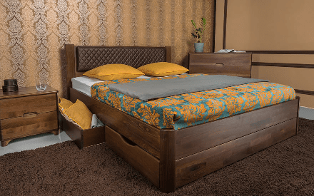 Кровати с выдвижными ящиками производятся из различных материалов: натуральное дерево, ЛДСП, МДФ и даже металл. Изголовье кровати может быть мягким, твердым или кованными.