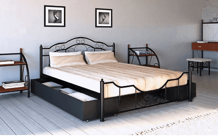Если Вы почитатель индустриального стиля в интерьере, то советуем обратить внимание на металлические кровати с ящиками из ДСП. Кровать «Кармен» с кованым изголовьем и вместительными ящиками займет почетное место интерьера спальни в стиле лофт.