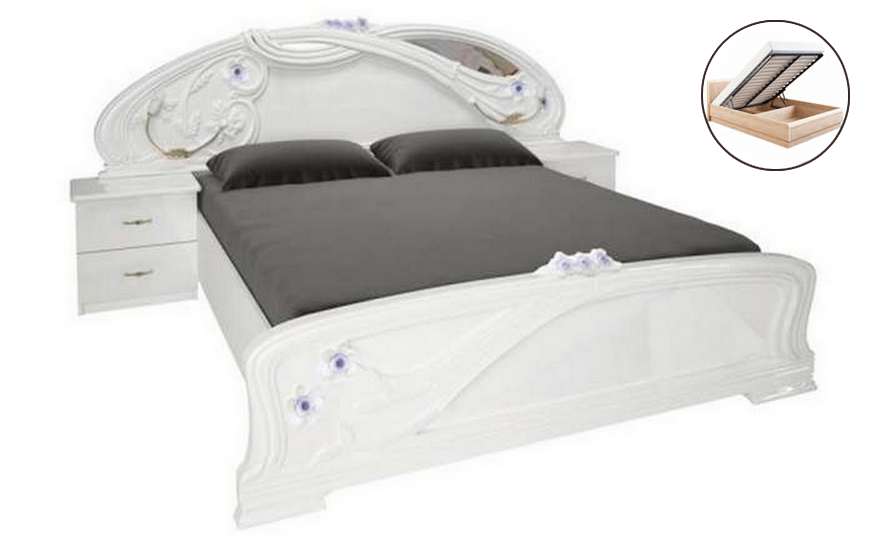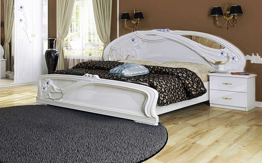 Укажите номер телефона и мы Вам перезвоним.Очередной дизайн, очаровывающий своей асимметричностью от мебельной фабрики Миро-Марк - это дизайн кровати из серии мебельных комплектов для спальни "Лулу". Белый глянцевый рельеф с цветами вызывает ассоциацию с весенним ветром и подснежниками, зеркальце на изголовье напоминает озеро, а изящные светильники по обе стороны кровати очень практичны и прекрасно вписываются в общий замысел.