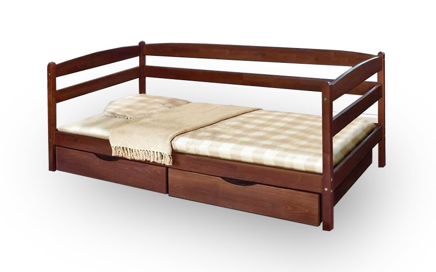 • Кровать "Ева с ящиками" - компактная и функциональная односпальная кровать с минималистичным дизайном. Кровать отлично подойдет для детской спальни, она не занимает много места, а от стены спальное место отделяют две продольные планки, переходящие в изножье и изголовье. В целом, кровать выглядит легкой и не перегруженной декоративными элементами. Ее можно использовать не только в качестве кровати, но и как удобный небольшой диванчик.
