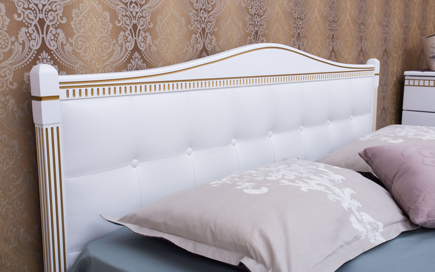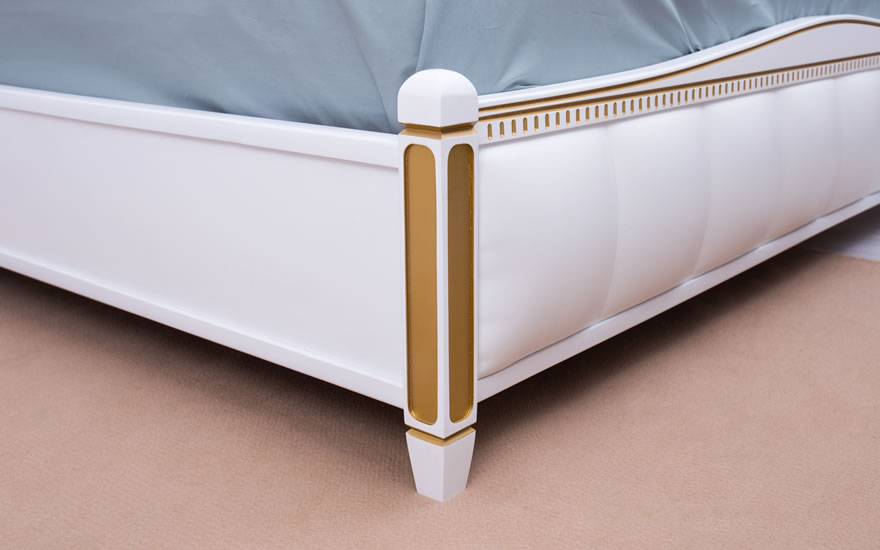 Фигурные изголовье и изножье выполнены из массива бука и МДФ. Их украшают пилястры с декоративной резьбой и патиной (серебро или золото).