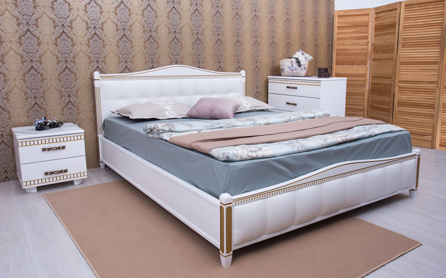 Фигурные изголовье и изножье выполнены из букового щита и МДФ. Их украшают пилястры с декоративной резьбой и патиной (серебро или золото).