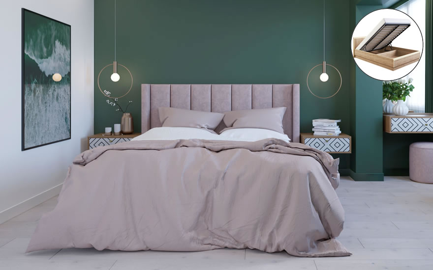 • Кровать Montreal с подъемным механизмом - неимоверно стильная, современная кровать в мягкой обивке. Высокое изголовье с вертикальной простежкой выглядит очень элегантно.