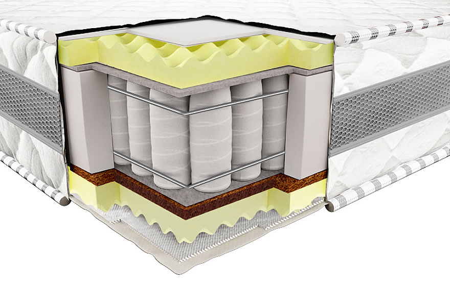 Различная степень жесткостиВ поверхностей матраса достигается путем использования настила из натуральной кокосовой койры с летней стороны матраса, придавая ей дополнительную упругость. Кокосовая койра используется для придания матрасу необходимой жесткости и обладает рядом прекрасных характеристик - прочностью, гигиеничностью, гипоаллергенностью и хорошей воздухопроводимостью.