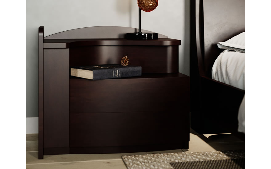 • Деревянная тумба Рио - красивый и функциональный аксессуар для спальни. Эта тумба не только элегантна, но и обладает весьма необычным экстерьером - ее плавно изогнутые поверхности выглядят очень оригинально. а два довольно емких ящика позволят без труда разместить множество нужных в спальне мелочей.