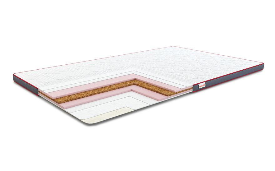 Достаточно тонкий двусторонний матрас. С одной стороны - кокосовое волокно, которое придает изделию жесткости, гибкости, прочности и долговечности. С другой стороны - специальный материал - Spring Foam, придающий упругости и мягкости.