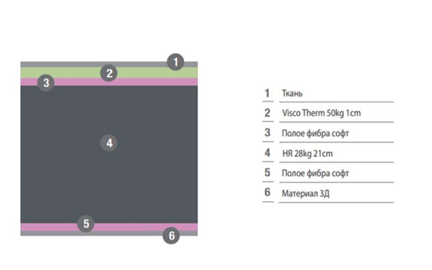 Порожнє фібра-софт, прокладене між пінними матеріалами сприяє додаткової циркуляції повітря, так як складається з безлічі пустотілих волокон, які забезпечують постійний повітрообмін, регуліліруют термобаланс і вирівнюють перепади температури під час сну. |