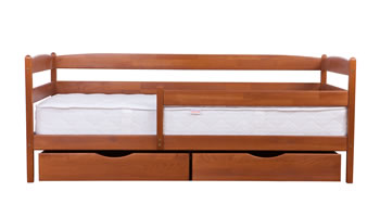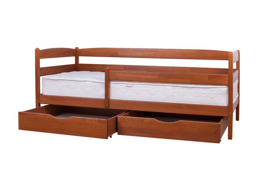 • Кращий варіант для дитячої спальні - дерев'яне ліжко з обмежувальними бортиками. Дана модель, виконана з твердих порід дерева, забезпечить здоровий сон і повну безпеку дитині. Ліжко має класичну конструкцію на ніжках, з однаковими по висоті опорними спинками у ізголів’я, ізніжжя і з однієї бічної сторони. Ліжко може бути укомплектоване місткими шухлядами, де можна зберігати ліжко або дитячі іграшки.