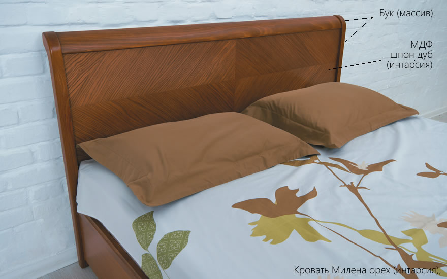 • Ізголів'я ліжка Мілена (інтарсія) виконано з масиву бука і МДФ плити, декорованого інтарсією в шпоні дуба.
