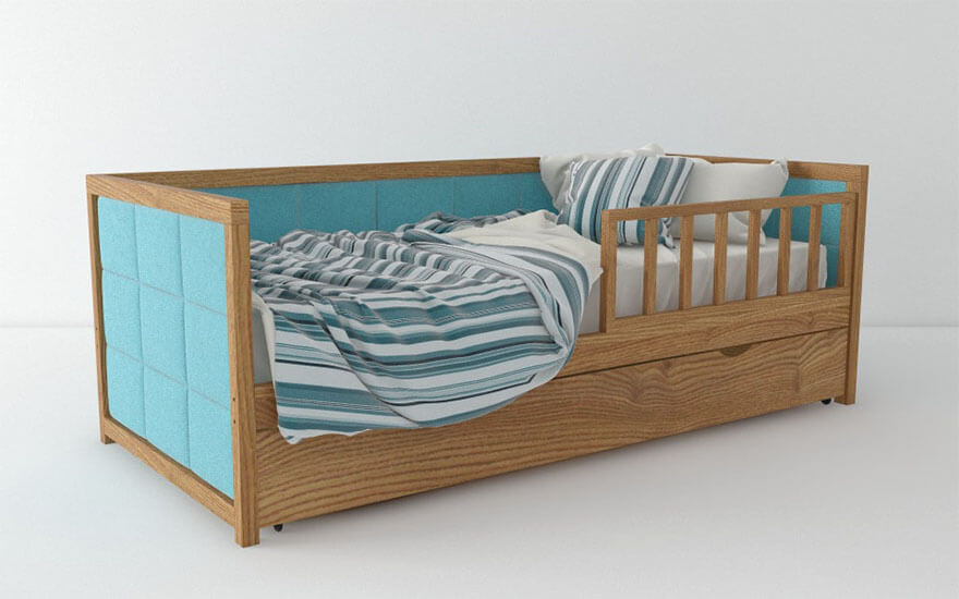 Кровать великолепная получилась. Деревянная, прочная,красивая. Мягкие вставки выбрали под интерьер детской комнаты.