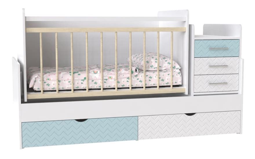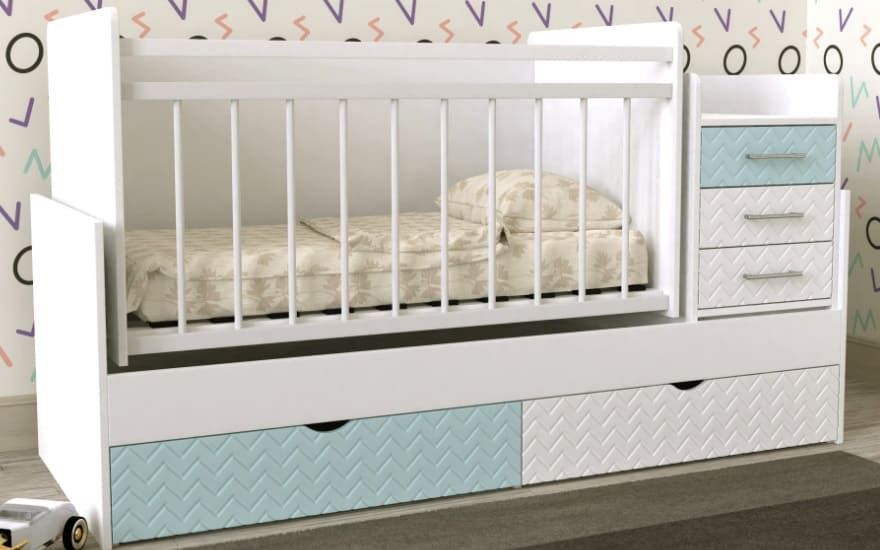 - в ліжечко вбудована тумба-пеленатор, на якій зручно міняти підгузки, одягати малюка, робити масаж. Тумба оснащений висувними ящиками в яких можна зберігати необхідні для дитини речі, які завжди повинні бути під рукою.