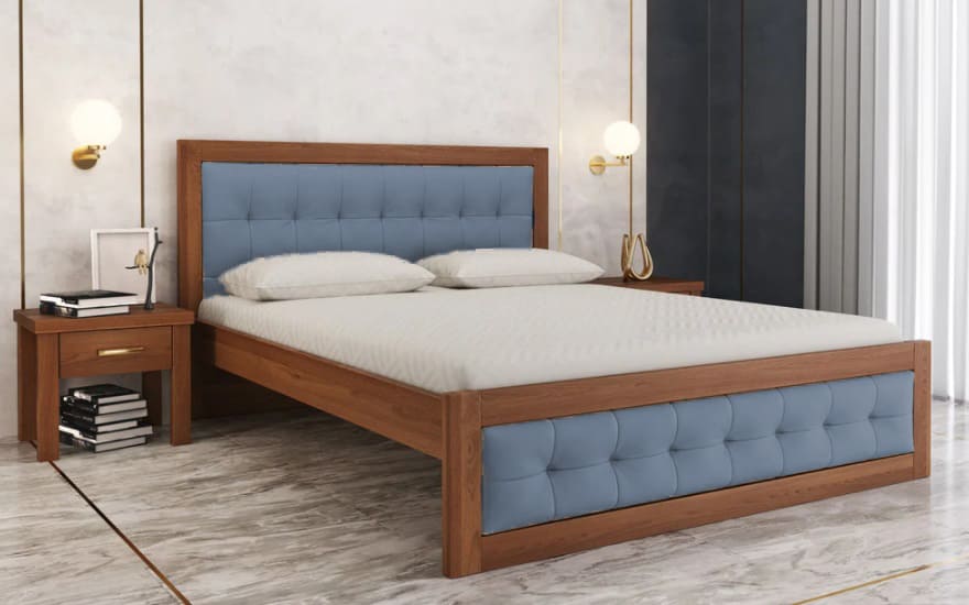 • Дерев'яне ліжко "Мадрид М50 Бук плюс" - ліжко прямих, чітких ліній, з м'якою, стеганой великими квадратами, вставкою в узголів'ї і на царге з меблевими гудзиками, обтягнутими основною тканиною. Ліжко виготовлене з натуральной деревини - щіта бука, покривається гіпоалергенним лаком італійського виробництва.