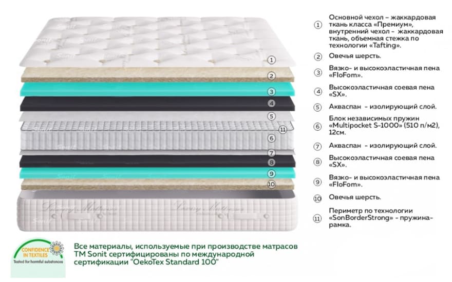 В основі ортопедичного матраца "MultiPocket S-100" (510 пружин на м2). Кожна пружина блоку укладена в окремий тканинний чохол, завдяки чому забезпечується робота кожної пружини незалежно одина від одної, товщина дроту - 1.3 мм, висота блоку - 12 см. У блоці "MultiPocket" збільшена кількість пружин, які забезпечують точковий розподіл навантаження на пружинний блок. Кожній ділянці вашого тіла приділяється в кілька разів більше уваги, що дозволяє отримати найвищий ортопедичний ефект спальній поверхні.