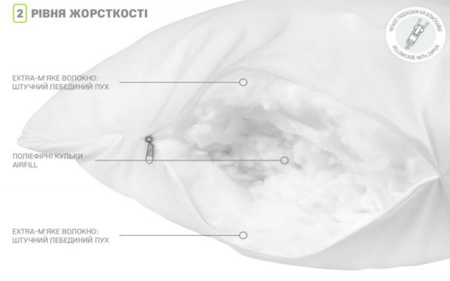 Штучний лебединий пух: не збивається, зберігає тепло, пропускає повітря, добре переться, не викликає алергії |