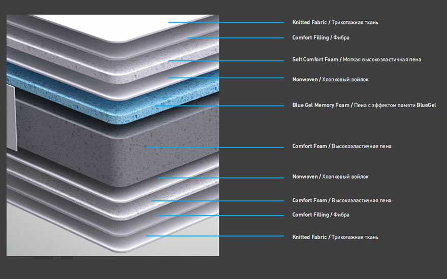 Піна пам'яті BlueGel - Інноваційний матеріал, що володіє унікальними в'язкоеластичними властивостями. Відчуваючи навантаження, матеріал швидко стискається, але потім, під дією температури тіла, плавно "обіймає" контури тіла, підлаштовуючись під них. Тіло людини не відчуває опору, виникає відчуття невагомості та неперевершеного комфорту. |