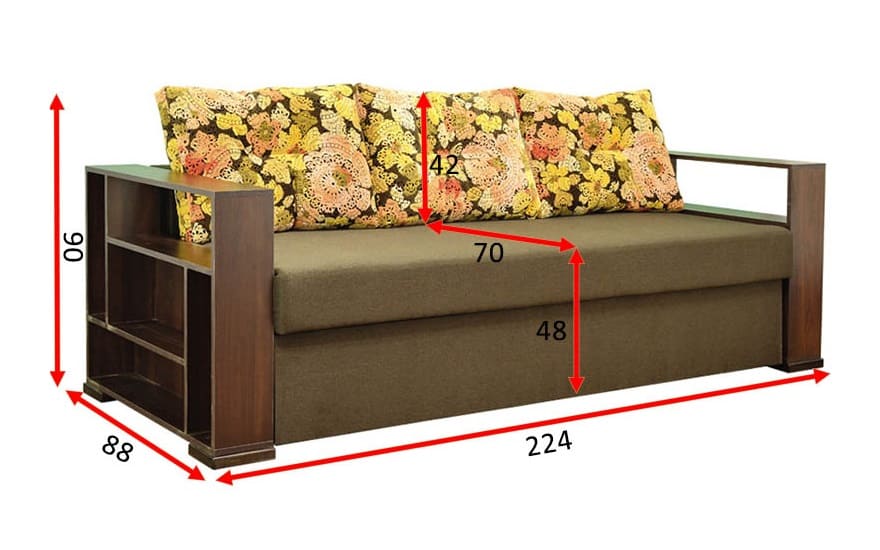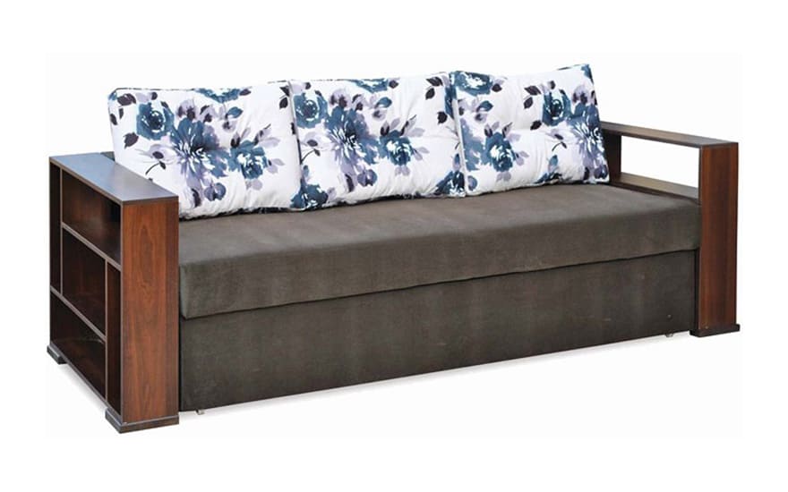 Обе боковины дивана декорированы тумбами с вместительными открытыми полочками из ЛДСП, на которые удобно поставить любимый десерт или хранить различные бытовые мелочи.