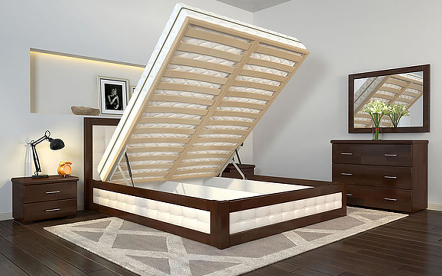 Кровать "Рената М Сосна" оснащена подъемным механизмом с гидравлическим пневмоцилиндром. Под основанием кровати имеется удобный и вместительный короб для хранения белья.