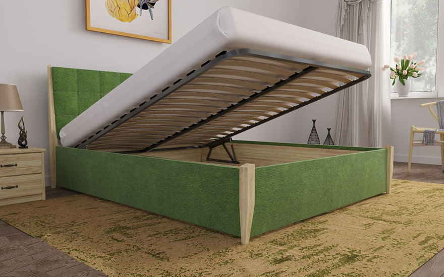 Кровать оснащена удобным в использовании подъемным механизмом: он мягко и бесшумно поднимает основание кровати, под которым имеется вместительный короб для хранения белья.
