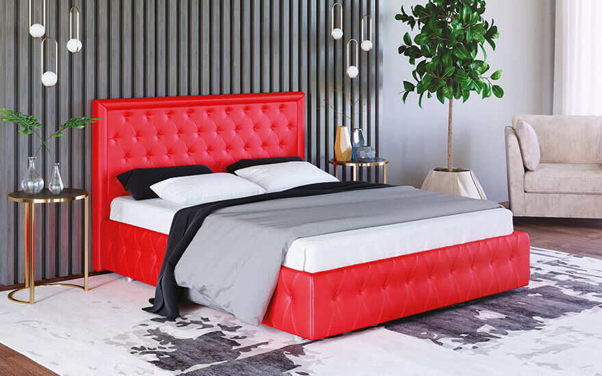 Изголовье, изножье и царги обиваются тканью или экокожей (материал и цвет обивки можно выбрать из представленных образцов на сайте).
