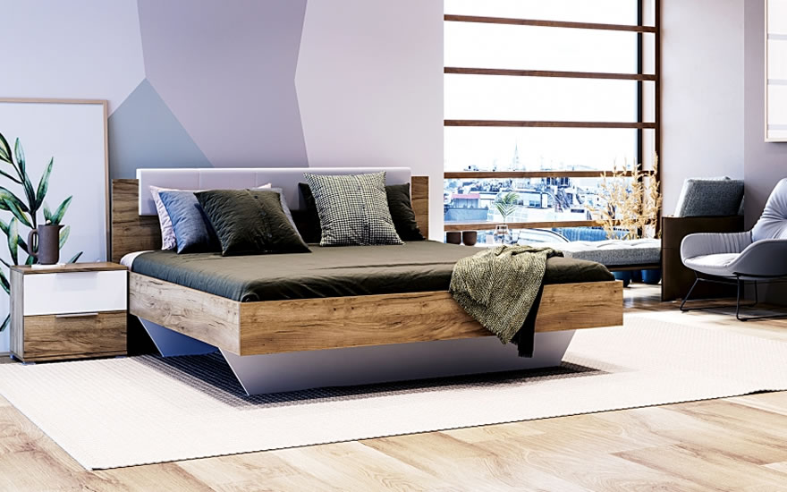 Двуспальная кровать из коллекции Asti отечественной мебельной фабрики Миро-Марк выполнена в современном минималистичном стиле с корпусом из ЛДСП. Строгие прямоугольные формы изголовья и боковых царг смягчаются мягкой вставкой из кожзама белого цвета. Сочетание цветов дуба и белого глянцевого создают ощущение натуральности и чистоты в интерьере.