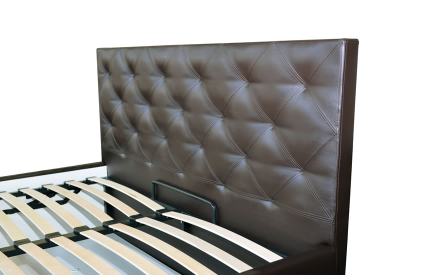 Изголовье и боковины кровати изготовлены из ДСП с наполнением из ППУ и синтепона, которое обшивается тканью или искусственной кожей и крепится к основанию металлического каркаса.