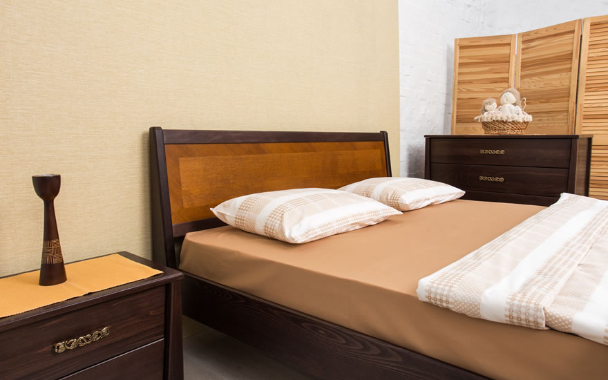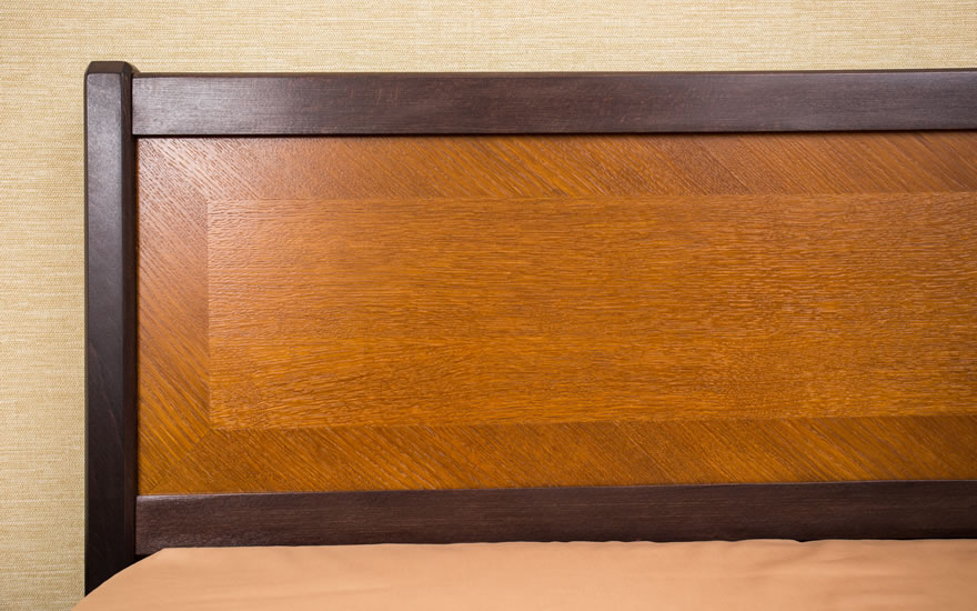 Изголовье и изножье кровати "Сити с интарсией и ящиками" выполнено из щита бука и МДФ плиты, декорированной интарсией в шпоне дуба.