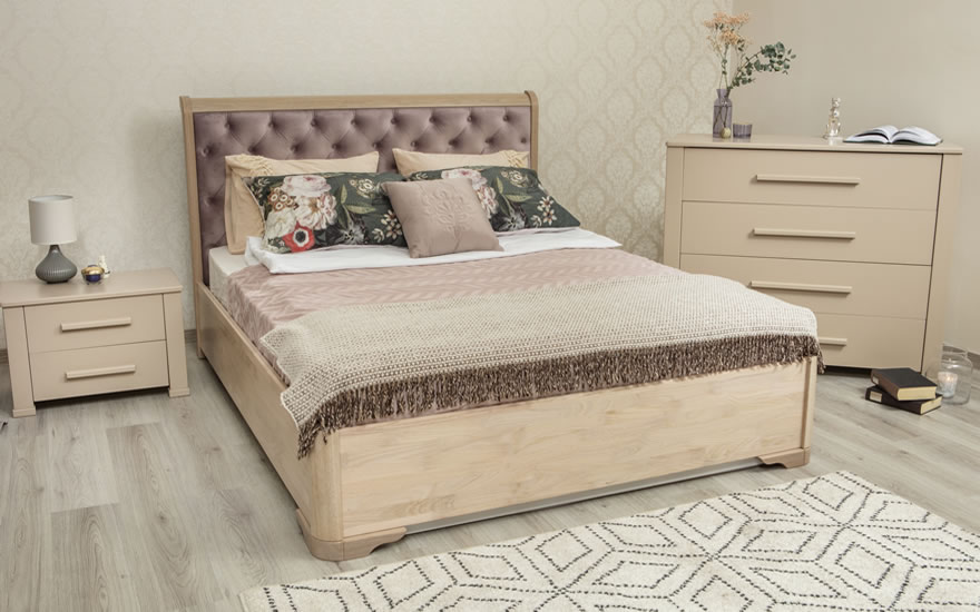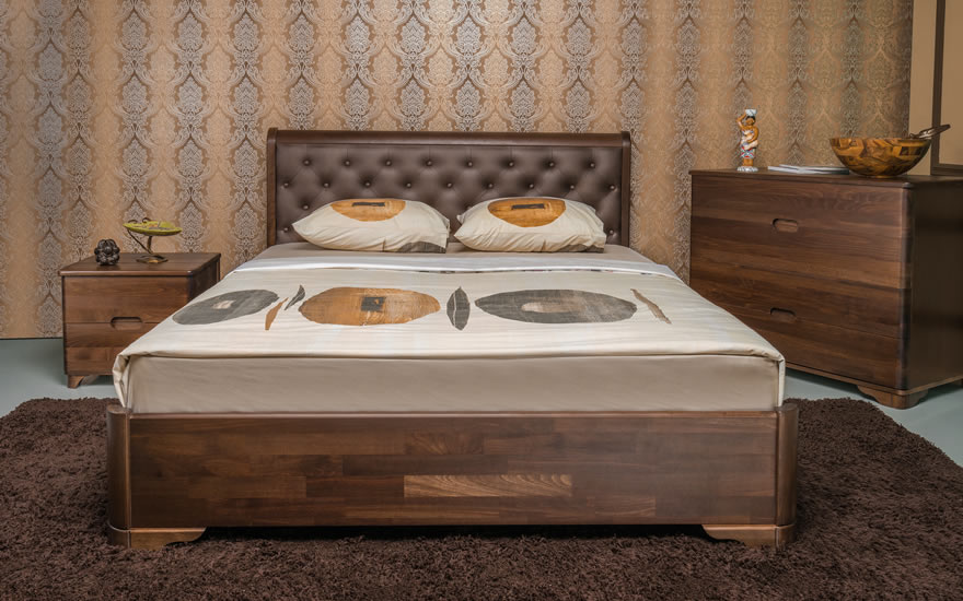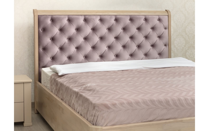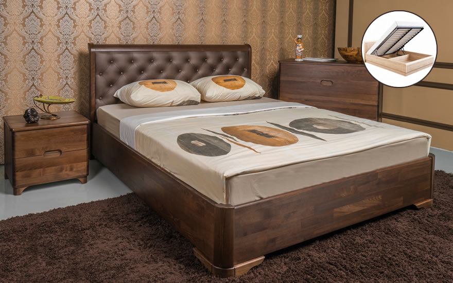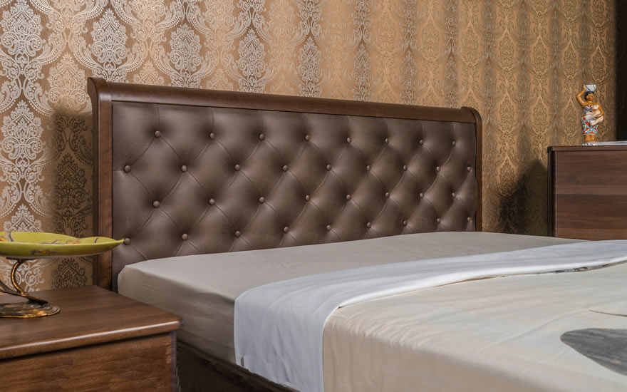 • Изголовье кровати "Милена Премиум с подъемным механизмом" выполнено из щита бука и МДФ плиты, спрятанной под стеганой обивкой из ППУ и экокожи.
