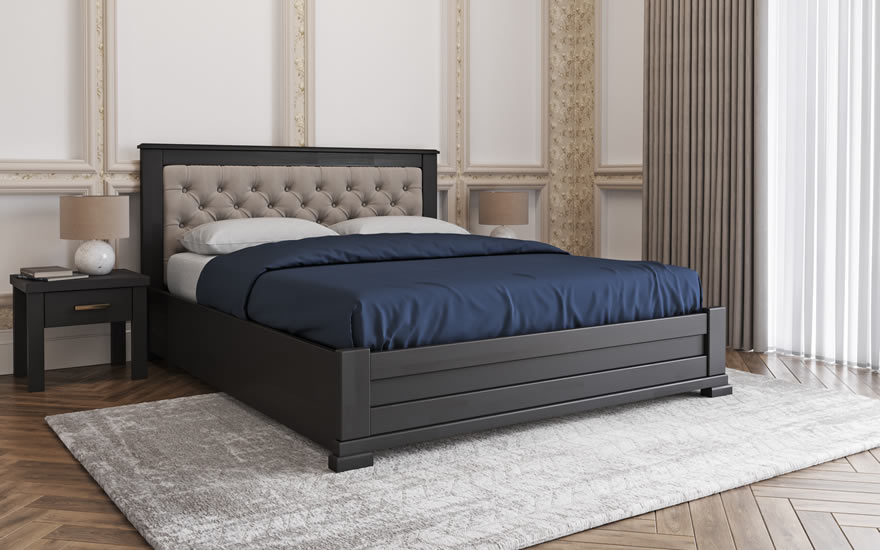 Изголовье кровати декорировано мягкой вставкой с глубокой каретной простежкой и мебельными пуговицами, обтянутыми основной тканью. Толщина мягкой части - 50 мм.