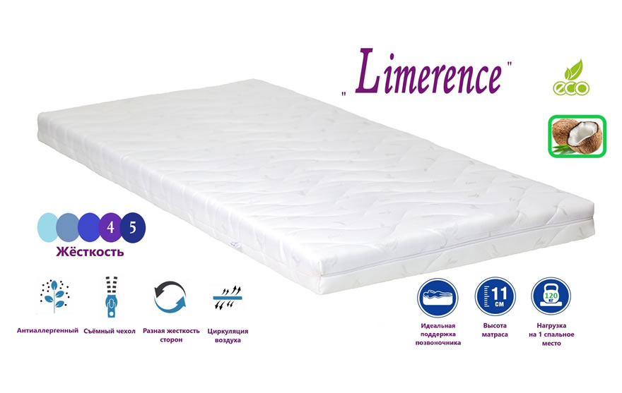 Матрас Limerence - двусторонний матрас с различной жесткостью сторон. Это идеальная комбинация кокосового полотна и ортопедической пены по типу "сендвич", что создает баланс жесткости и эластичности. |