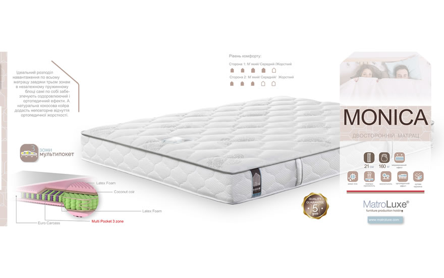 • "Monika" - ортопедический матрас c разносторонней жесткостью. Основа матраса - пружинный блок независимых пружин "Pocket Spring" с тремя зонами жесткости, усиленный рамками из прокатной стали и угловой поддержкой "Butterfly".