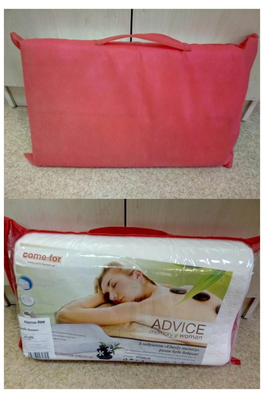 Переваги: Удобная, красивая, запаха не заметили, выветривать не пришлось, понравился самовывоз, возможность на месте посмотреть не только эту подушку, но и другие. Консультант очень приветливая и внимательная, дала много информации по разной продукции