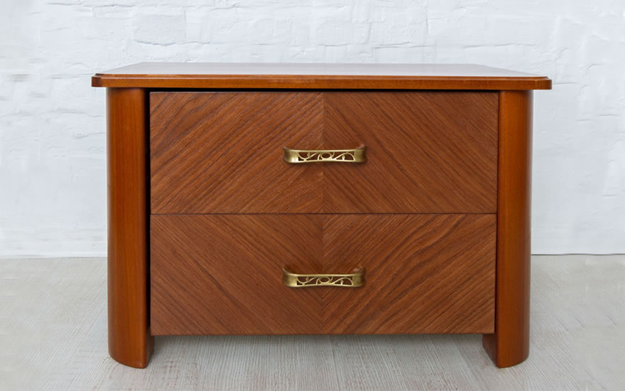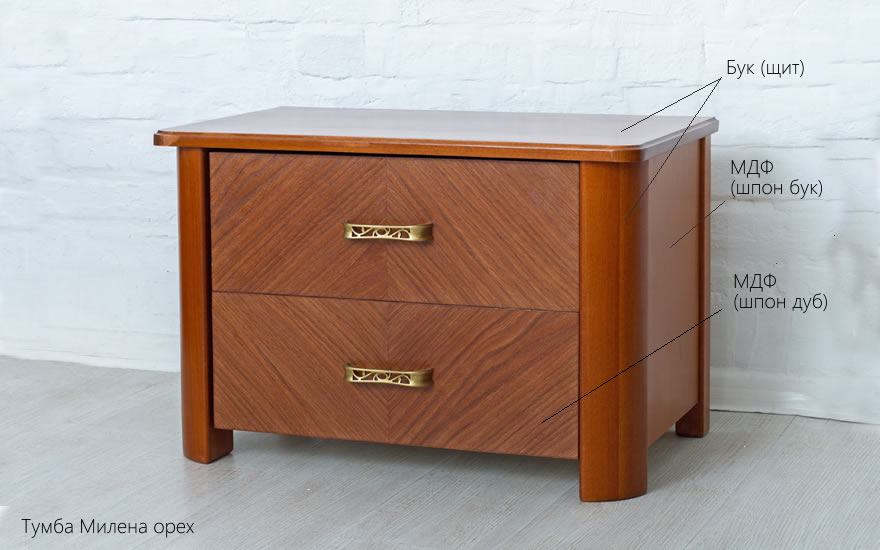 Боковины тумбы - из МДФ в шпоне бука. Боковины ящиков - ламинированная ДСП, дно ящиков - ДВП.