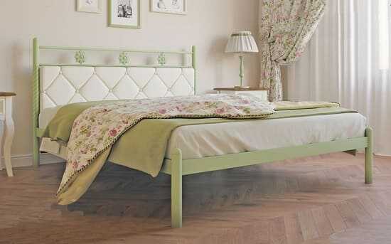 - Ліжко «Белла» - металеве, лаконічне ліжко оливкового кольору з м'яким стьобаним узголів'ям. Завдяки кольору каркаса і витонченим вигинам відмінно впишеться в сучасний класичний інтер'єр.