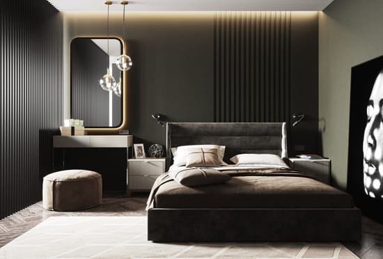 ліжко City, завдяки своєму геометричному узголів'ю, яке відмінно поєднується з геометричним візерунком на шпалерах і фігурними елементами ламп, а благородний сіро-коричневий колір ліжка лише підкреслює бездоганний смак господаря.
