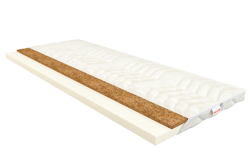 Достаточно тонкий двусторонний матрас. С одной стороны - кокосовое волокно, которое придает изделию жесткости, гибкости, прочности и долговечности. С другой стороны - специальный материал - Spring Foam, придающий упругости и мягкости.