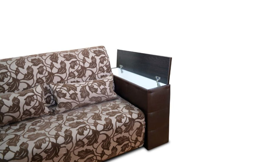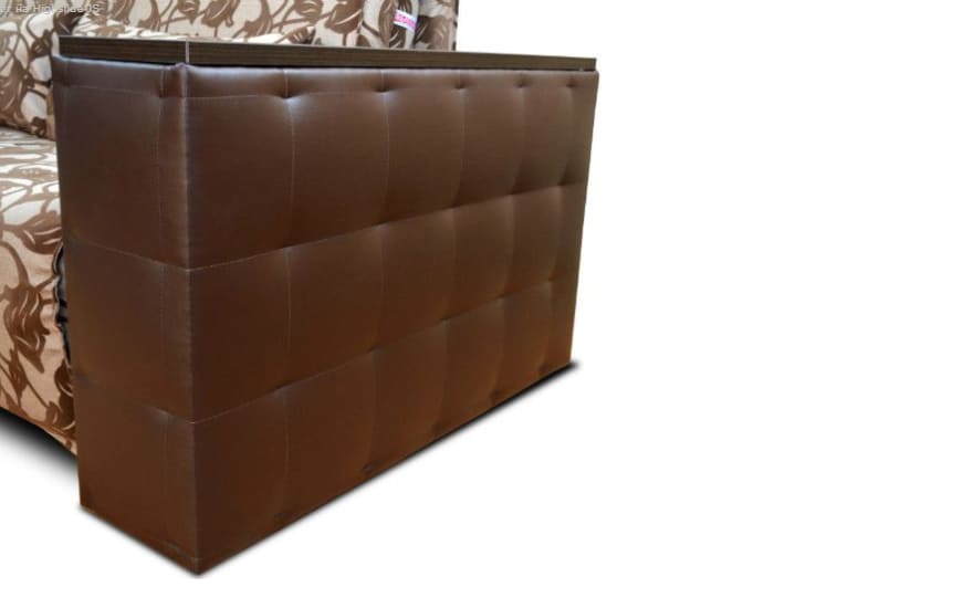 Оригінальності дивану додають дизайнерські підлокітники з об'ємною простежкой з екокожі. На підлокітниках передбачені накладки з ЛДСП. Усередині підлокітників містка ніша для білизни.