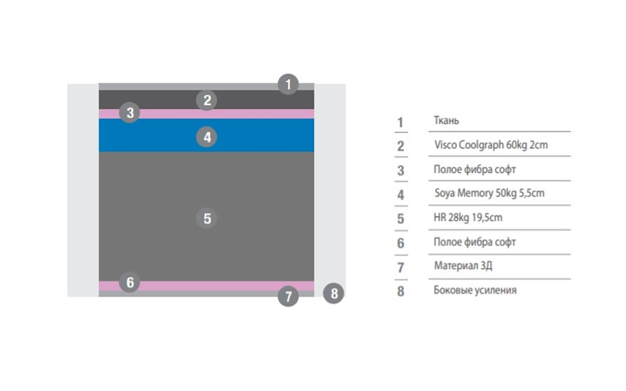 Порожнє фібра-софт, прокладений між пінними матеріалами сприяють додаткової циркуляції повітря, так як складається з безлічі пустотілих волокон, які забезпечують постійний повітрообмін, регуліліруют термобаланс і вирівнюють перепади температури під час сну. |