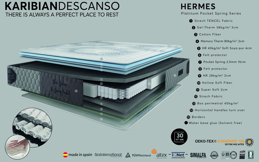 Матрац Hermes - матрац з анатомічним, ортопедичним і ергономічним ефектом. Чудове поєднання незалежного пружинного блоку Pocket Spring 1.8 мм (15 см) і суперсучасних пінних матеріалів з різною щільністю і еластичністю забезпечить не тільки оптимальну підтримку всьому хребту, а й абсолютне розслаблення всіх груп м'язів. Пружинний блок з двох сторін ізольований від інших матеріалів наповнення повстяним захистом.