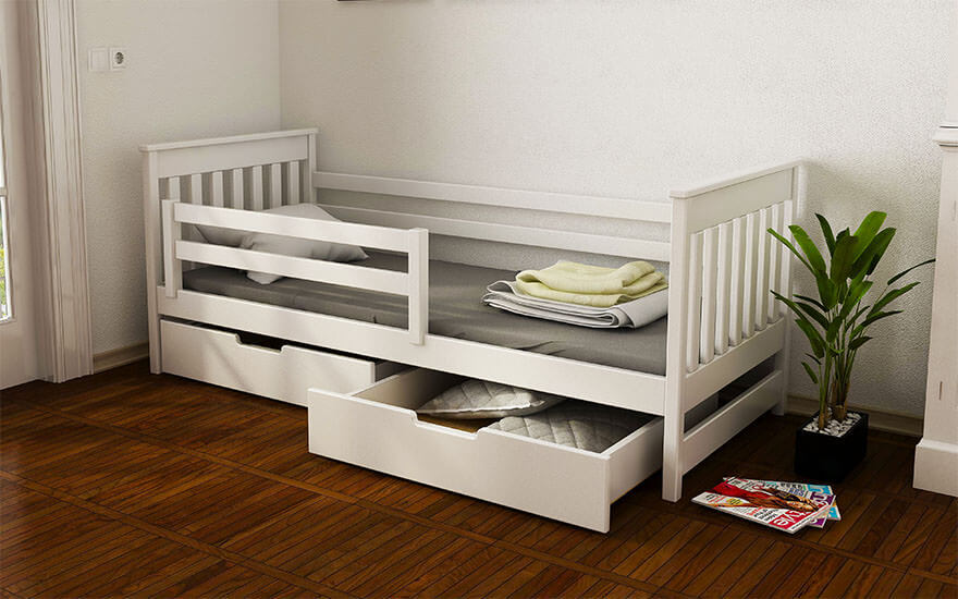 Додатково, ліжко можна обладнати висувними шухлядами. Каркас шухляди виготовлений з ДСП (відтінок вибраного кольору ліжка), фасад - буковий щит, також пофарбований в основний тон ліжка. Механізм висування - меблевий ролик і спеціальні обмежувачі на ліжку, які виконують роль стопора та не дозволяють шухляді заїжджати за межі царги. Особливість шухляди - додаткове ребро жорсткості під дном, яке дозволяє ящику витримувати великі навантаження.