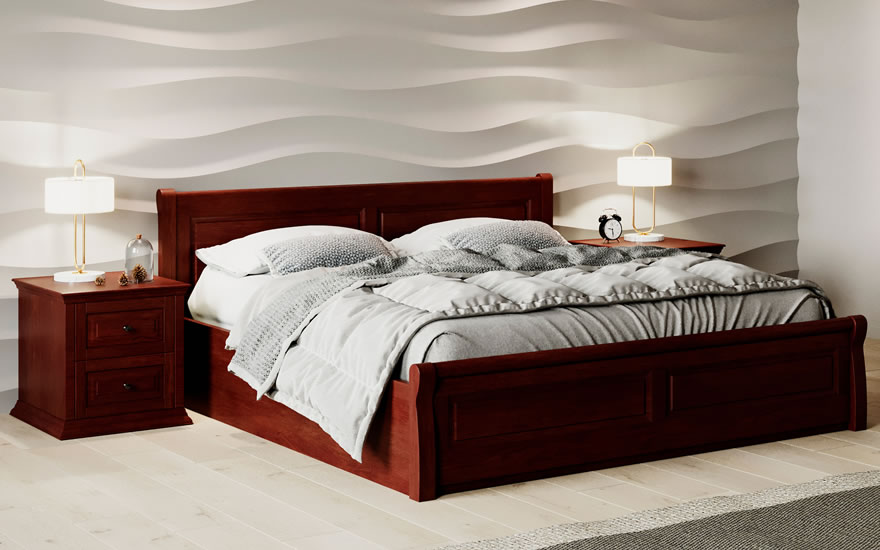 Ліжко не має ніжок, бокові царги широкі, повністю закривають бокові частини ліжка.
