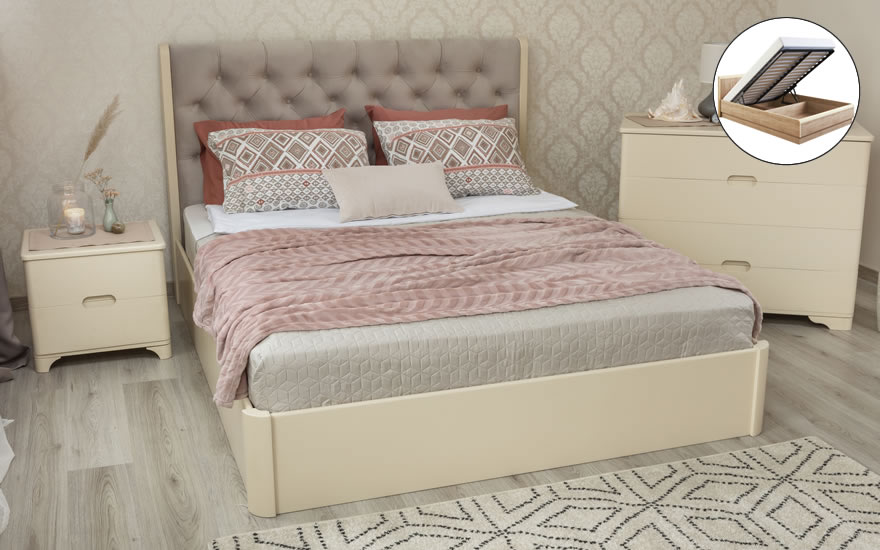 Красивая кровать с шикарным изголовьем. Заказывали с металлической рамой и усиленными ламелиями. Кровать из бука, подъемный механизм работает безшумно. Доставили в сроки ,как и договаривались.