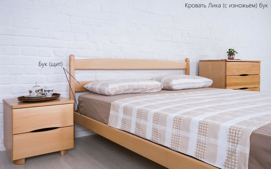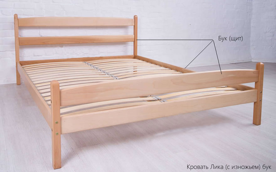 • Ліжко "Ліка" (з ізніжжям) - виконане з букового щита, підставою під матрац служать вкладні березові ламелі з кроком 5 см, посилені поздовжньої і поперечної рейкою з бука.
