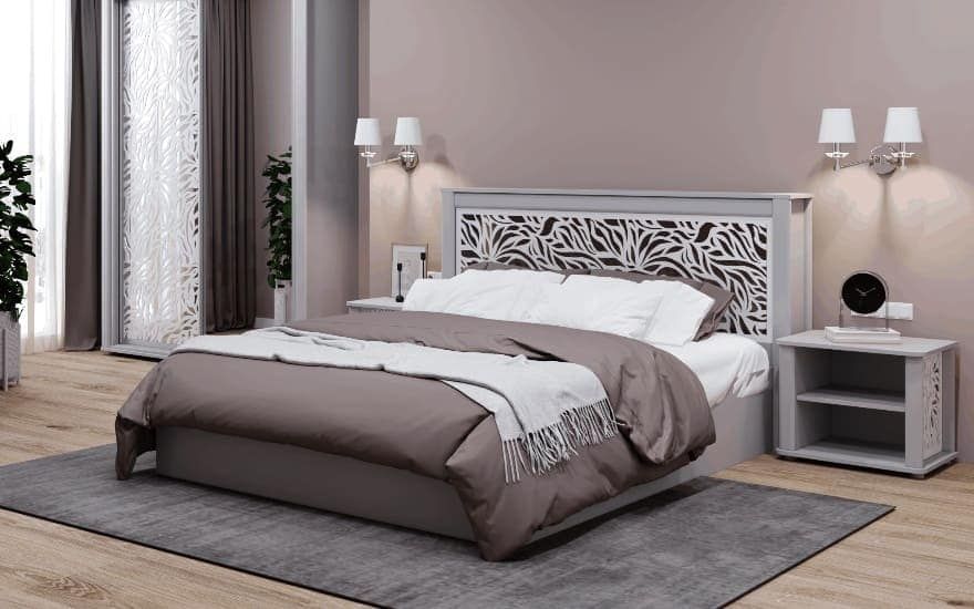 В узголів'ї ліжка дзеркало з витонченим візерунком, таке дизайнерське рішення надає моделі особливого шарму.