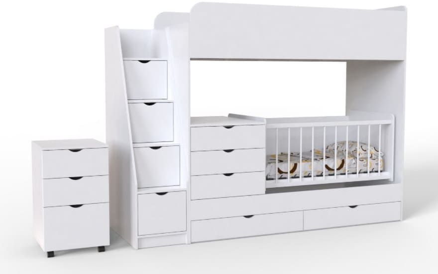 • комфортне ліжко на другому рівні 80х190 см, з високим бортиком, який перешкоджає падінню дитини під час сну. Дитяче ліжко-люлька з решіткою на першому рівні 60х190 см. Зверніть увагу, що з часом, нижнє ліжко можна трансформувати в спальне місце для дитини, що підросла прибравши люльку і комод. Ортопедичний матрац не входить в комплектацію, замовляється окремо.