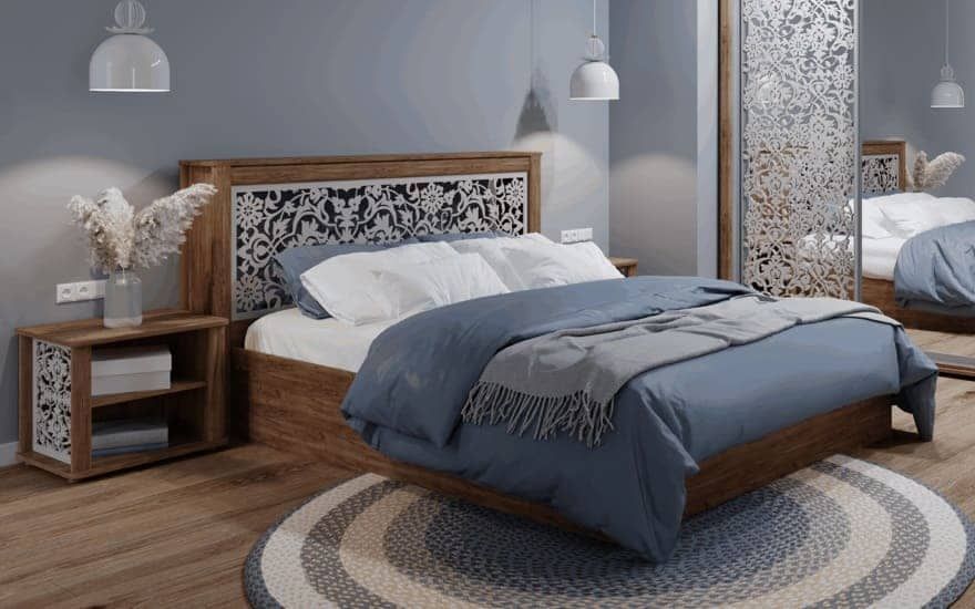 В узголів'ї ліжка рызблення з витонченим візерунком, таке дизайнерське рішення надає моделі особливого шарму.