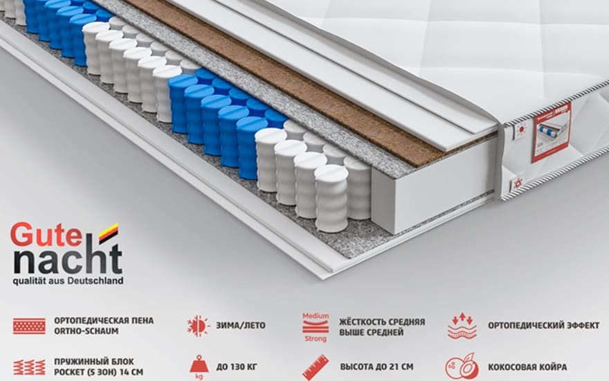 В основі ортопедичного матраца блок незалежних пружин "Pocket Spring" з 5-ю зонами комфорту (14 см).