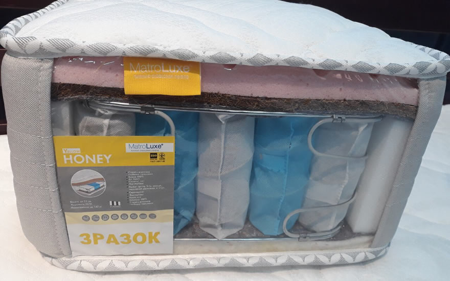 • Ортопедичний двосторонній матрац Honey з нової колекції матраців Yellow забезпечить чудову ортопедичну підтримку хребта і комфортний сон на довгий час, завдяки основі з многозонального блоку пружин, посиленого подвійною бічною рамкою, інноваційною кутовою підтримкою Butterfy, та наповнювачам преміум класу. Відчуття м'якості досягається шляхом використання в якості верхніх настилів Air Foam і Foam-mix. Ці матеріали чудово пропускають повітря, безпечні для людей, які страждають від алергічних реакцій, їх використання не тільки підвищує рівень комфортності, але й сприяэ правильному й рівномірному розподілу навантаження на матрац.
