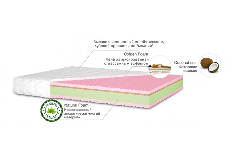 Латексована піна Oxigen Foam в поєднанні з кокосовою койрою дозволяють зберегти природне положення тіла, підтримуючи хребет і створюючи масажний ефект.